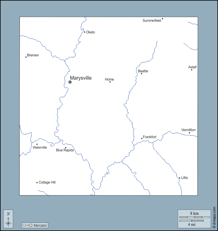 d-maps > संयुक्त राज्य > कैनसस > मार्शल > बाह्यरेखा, जल-सर्वेक्षण, मुख्य शहरों, नाम