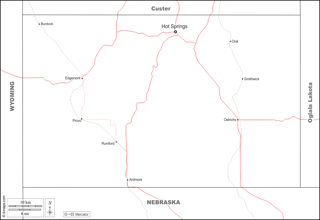 d-maps > संयुक्त राज्य > साउथ डकोटा > पतन नदी > सीमाओं, मुख्य शहरों, सड़कों, नाम, सफेद