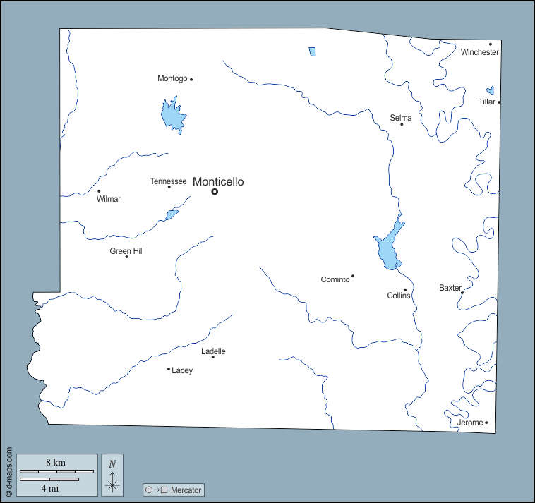 d-maps > संयुक्त राज्य > आर्कन्सा > ड्रयू > बाह्यरेखा, जल-सर्वेक्षण, मुख्य शहरों, नाम
