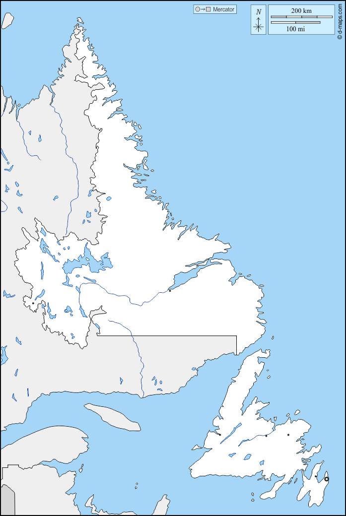 d-maps > महाअमेरिका > कनाडा > न्यूफ़ाउंडलैंड और लैब्राडोर > सीमाओं, जल-सर्वेक्षण, मुख्य शहरों