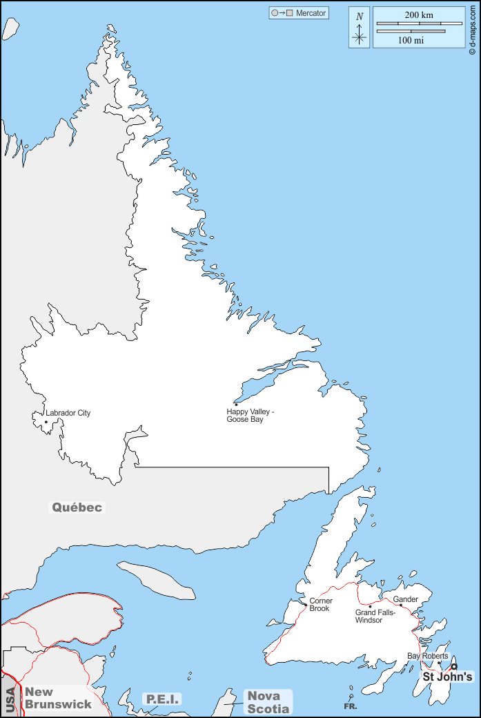 d-maps > महाअमेरिका > कनाडा > न्यूफ़ाउंडलैंड और लैब्राडोर > सीमाओं, मुख्य शहरों, सड़कों, नाम