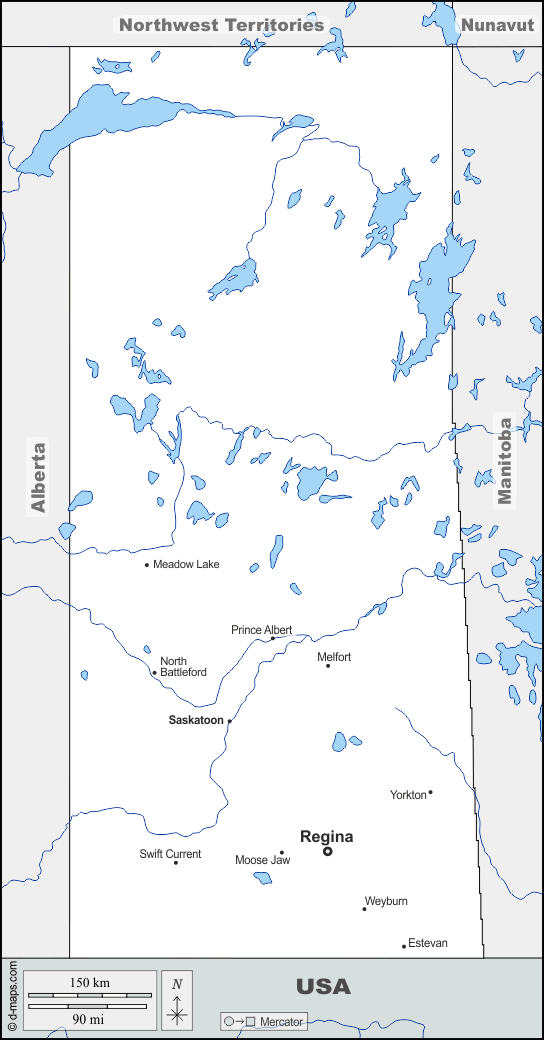 d-maps > महाअमेरिका > कनाडा > सैस्कैचेवेन > सीमाओं, जल-सर्वेक्षण, मुख्य शहरों, नाम