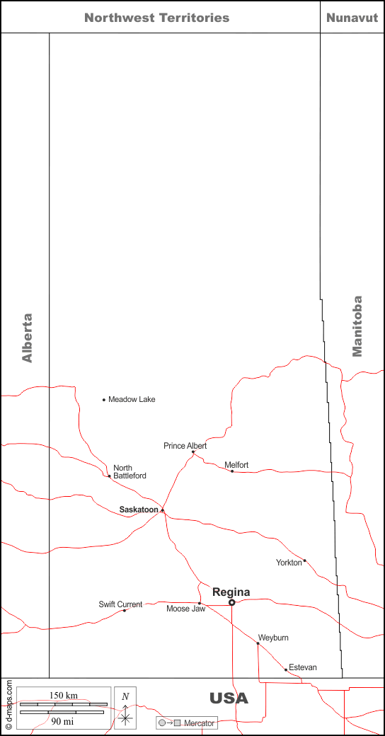 d-maps > महाअमेरिका > कनाडा > सैस्कैचेवेन > सीमाओं, मुख्य शहरों, सड़कों, नाम, सफेद