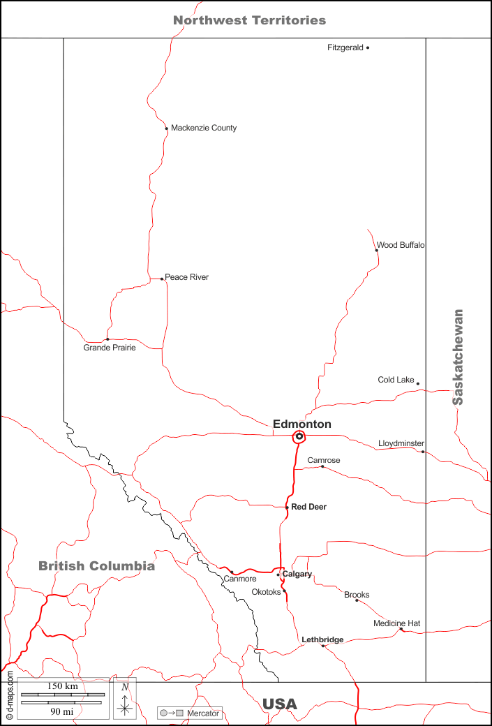 d-maps > महाअमेरिका > कनाडा > अलबर्टा > सीमाओं, मुख्य शहरों, सड़कों, नाम, सफेद