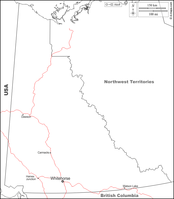 d-maps > महाअमेरिका > कनाडा > यूकॉन > सीमाओं, मुख्य शहरों, सड़कों, नाम, सफेद