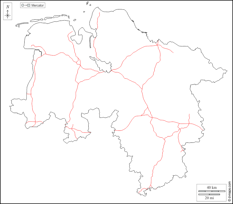 d-maps > यूरोप > जर्मनी > लोअर सैक्सोनी राज्य > बाह्यरेखा, सड़कों, सफेद