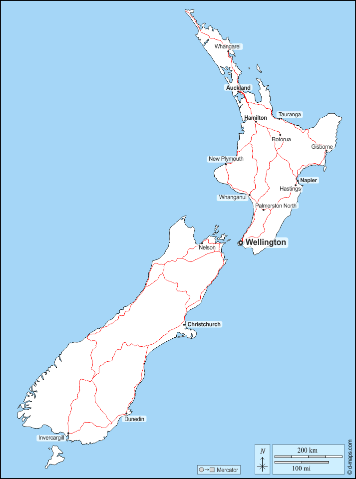 d-maps > ओशिनिया > न्यूजीलैंड > तटों, मुख्य शहरों, सड़कों, नाम