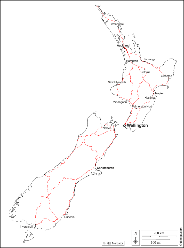 d-maps > ओशिनिया > न्यूजीलैंड > तटों, मुख्य शहरों, सड़कों, नाम, सफेद
