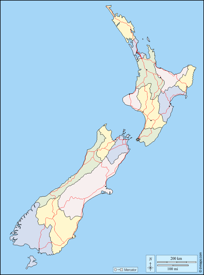 d-maps > ओशिनिया > न्यूजीलैंड > तटों, क्षेत्रों, मुख्य शहरों, सड़कों, रंग