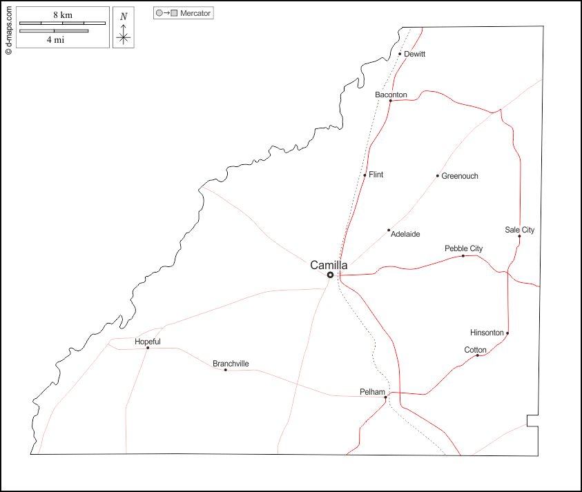 d-maps > संयुक्त राज्य > जॉर्जिया > मिशेल > बाह्यरेखा, मुख्य शहरों, सड़कों, नाम, सफेद