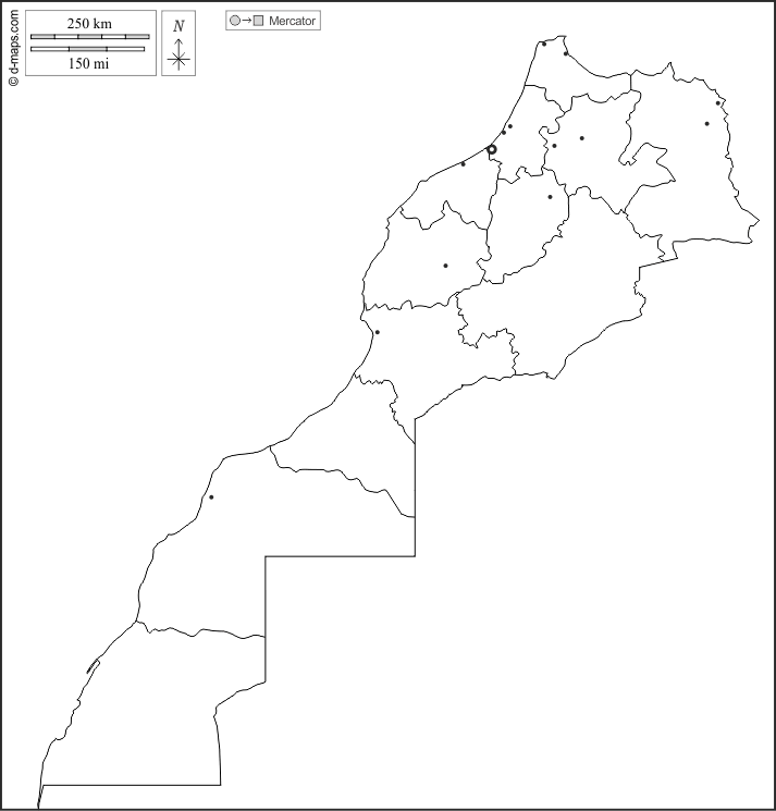 d-maps > अफ्रीका > मोरक्को > पश्चिमी सहारा के साथ मोरक्को > बाह्यरेखा, क्षेत्रों, मुख्य शहरों, सफेद