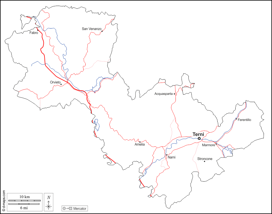 d-maps > यूरोप > इटली > टर्नी > बाह्यरेखा, जल-सर्वेक्षण, मुख्य शहरों, सड़कों, नाम, सफेद