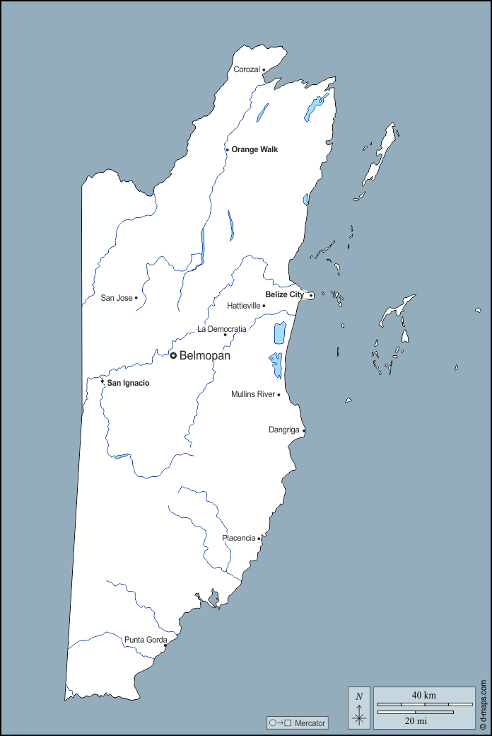 d-maps > महाअमेरिका > बेलीज़ > बाह्यरेखा, जल-सर्वेक्षण, मुख्य शहरों, नाम