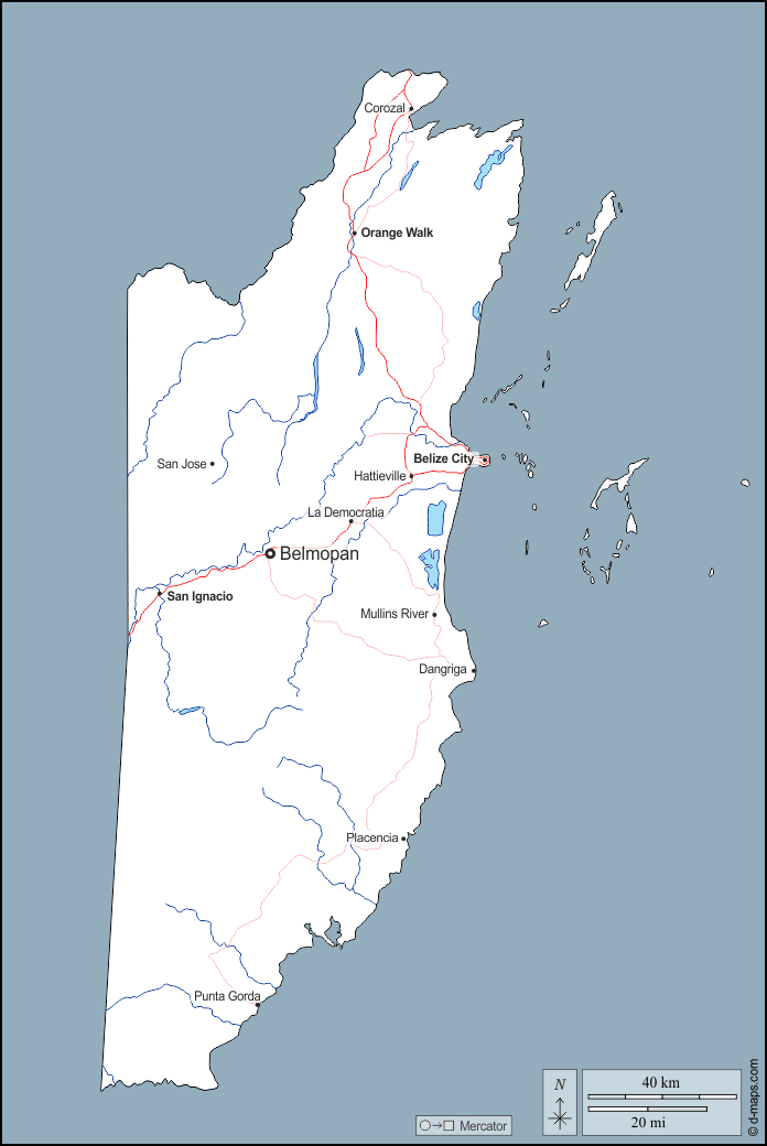 d-maps > महाअमेरिका > बेलीज़ > बाह्यरेखा, जल-सर्वेक्षण, मुख्य शहरों, सड़कों, नाम
