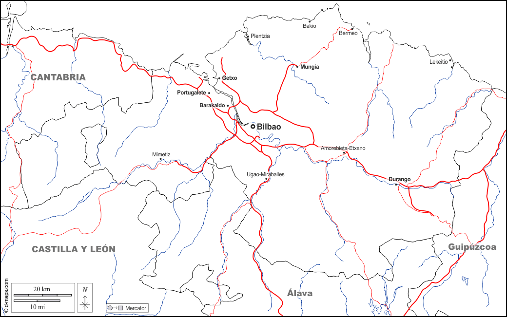 d-maps > यूरोप > स्पेन > बिस्के > सीमाओं, जल-सर्वेक्षण, मुख्य शहरों, सड़कों, नाम, सफेद