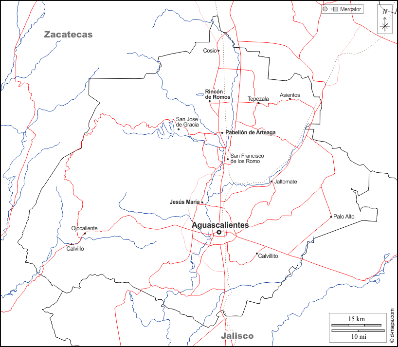 d-maps > महाअमेरिका > मेक्सिको > अगुआस्केलिएन्टेस > सीमाओं, जल-सर्वेक्षण, मुख्य शहरों, सड़कों, नाम, सफेद