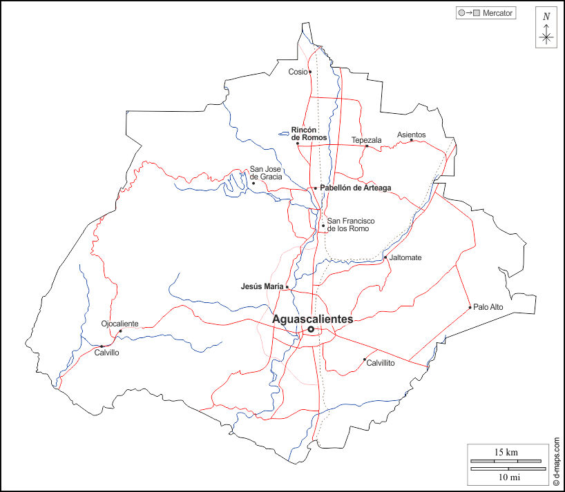 d-maps > महाअमेरिका > मेक्सिको > अगुआस्केलिएन्टेस > बाह्यरेखा, जल-सर्वेक्षण, मुख्य शहरों, सड़कों, नाम, सफेद