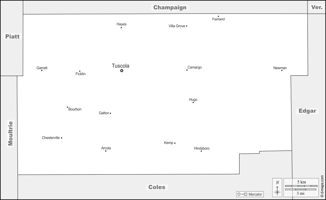 d-maps > संयुक्त राज्य > इलिनॉय > डगलस > सीमाओं, मुख्य शहरों, नाम