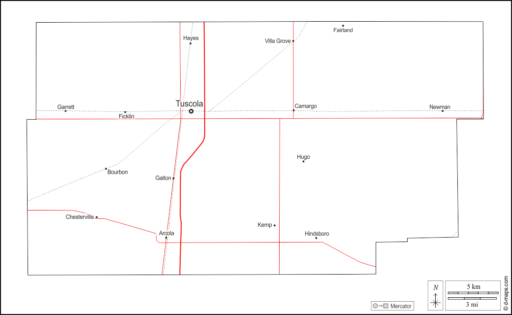 d-maps > संयुक्त राज्य > इलिनॉय > डगलस > बाह्यरेखा, मुख्य शहरों, सड़कों, नाम, सफेद