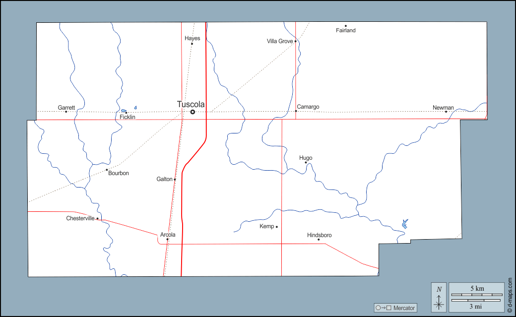 d-maps > संयुक्त राज्य > इलिनॉय > डगलस > बाह्यरेखा, जल-सर्वेक्षण, मुख्य शहरों, सड़कों, नाम