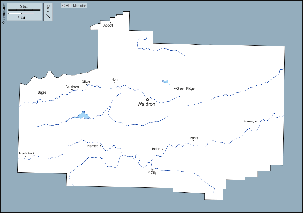d-maps > संयुक्त राज्य > आर्कन्सा > स्कॉट > बाह्यरेखा, जल-सर्वेक्षण, मुख्य शहरों, नाम