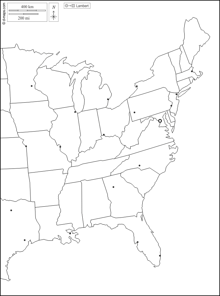 d-maps > महाअमेरिका > संयुक्त राज्य > संयुक्त राज्य अमेरिका के पूर्वी तट > बाह्यरेखा, राज्यों, मुख्य शहरों, सफेद