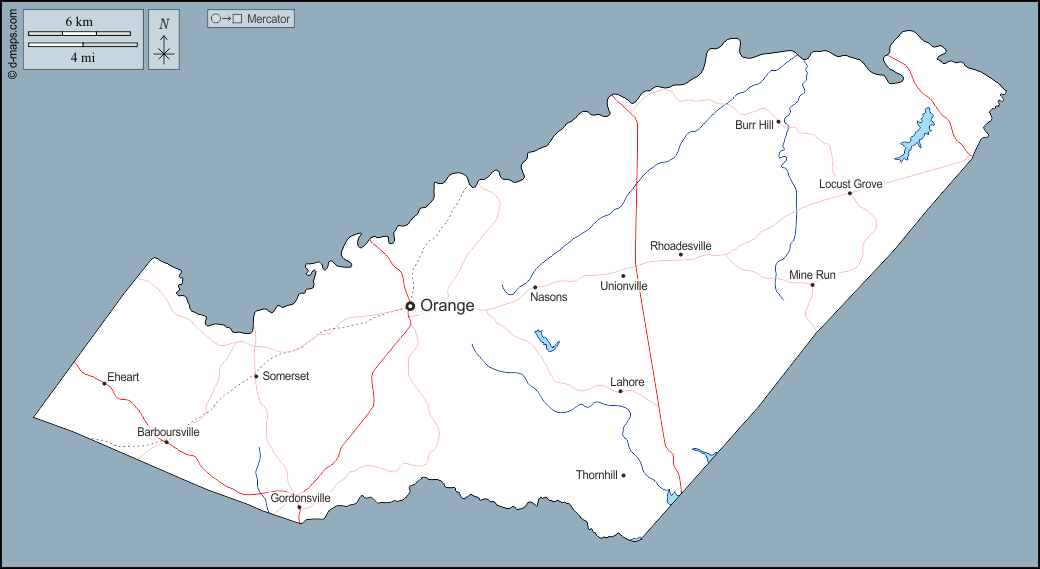 d-maps > संयुक्त राज्य > वर्जीनिया > नारंगी > बाह्यरेखा, जल-सर्वेक्षण, मुख्य शहरों, सड़कों, नाम