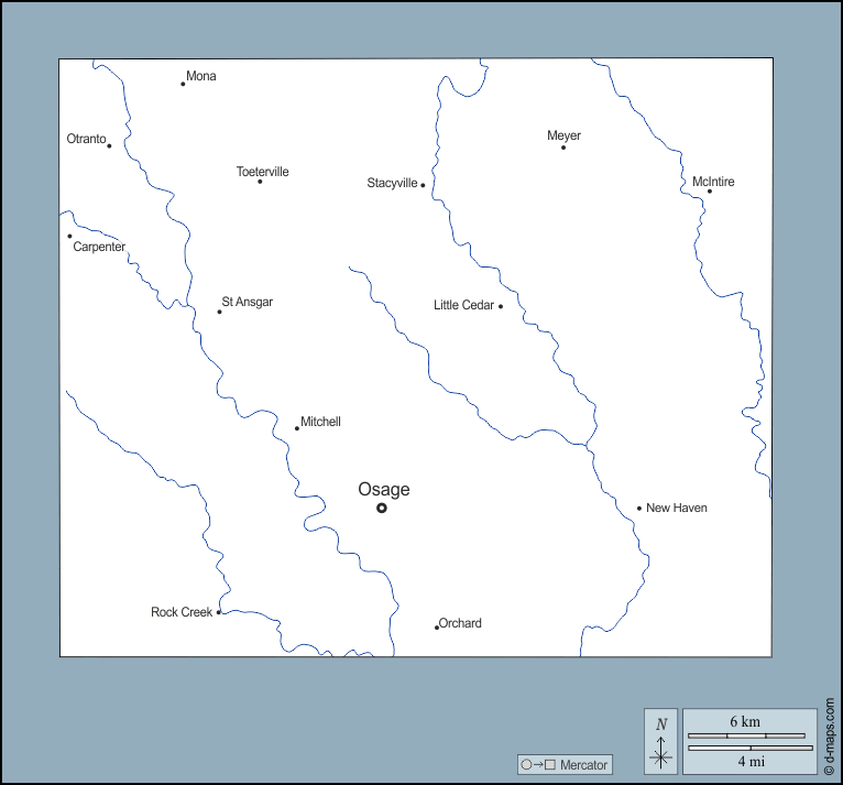 d-maps > संयुक्त राज्य > आयोवा > मिशेल > बाह्यरेखा, जल-सर्वेक्षण, मुख्य शहरों, नाम