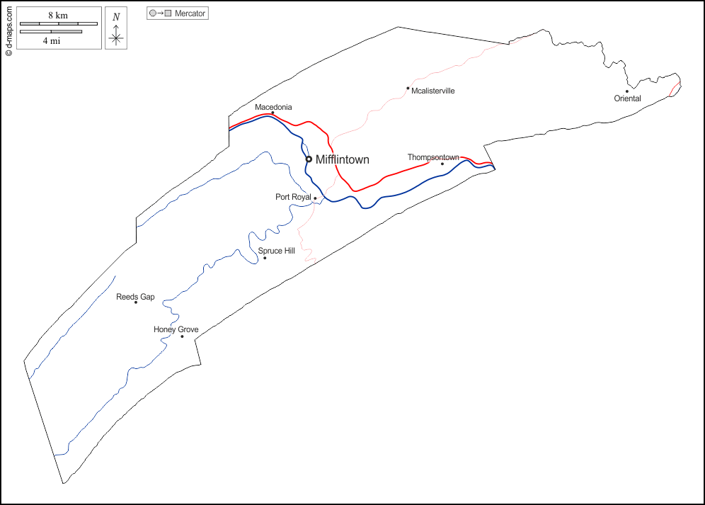 d-maps > संयुक्त राज्य > पेंसिल्वेनिया > जूनियाटा > बाह्यरेखा, जल-सर्वेक्षण, मुख्य शहरों, सड़कों, नाम, सफेद