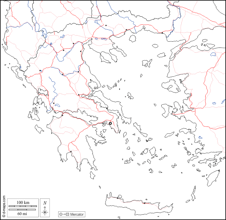 d-maps > यूरोप > यूनान > यूनान > सीमाओं, जल-सर्वेक्षण, मुख्य शहरों, सड़कों, सफेद