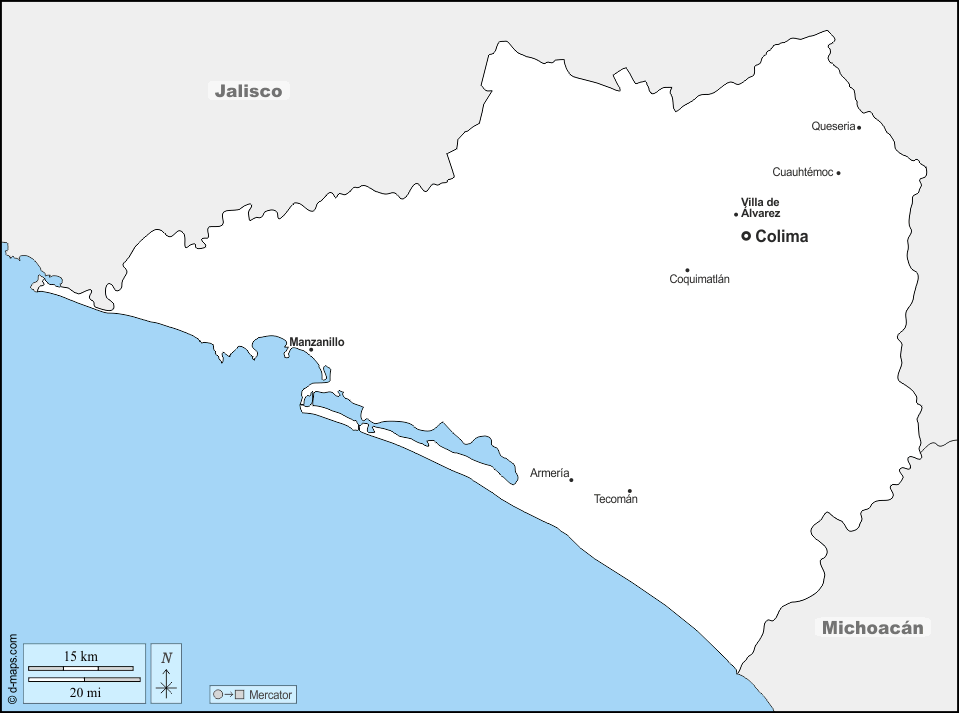 d-maps > महाअमेरिका > मेक्सिको > कोलिमा > सीमाओं, मुख्य शहरों, नाम