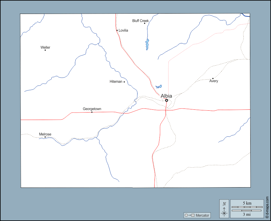 d-maps > संयुक्त राज्य > आयोवा > मुनरो > बाह्यरेखा, जल-सर्वेक्षण, मुख्य शहरों, सड़कों, नाम