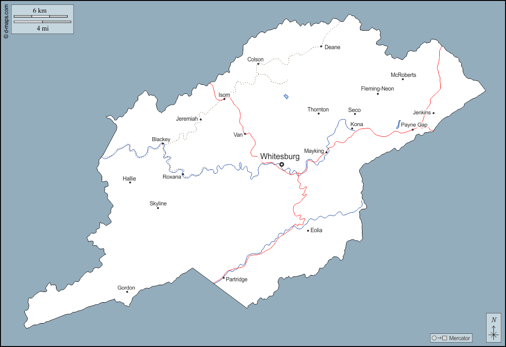d-maps > संयुक्त राज्य > केंटुकी > लेचर > बाह्यरेखा, जल-सर्वेक्षण, मुख्य शहरों, सड़कों, नाम
