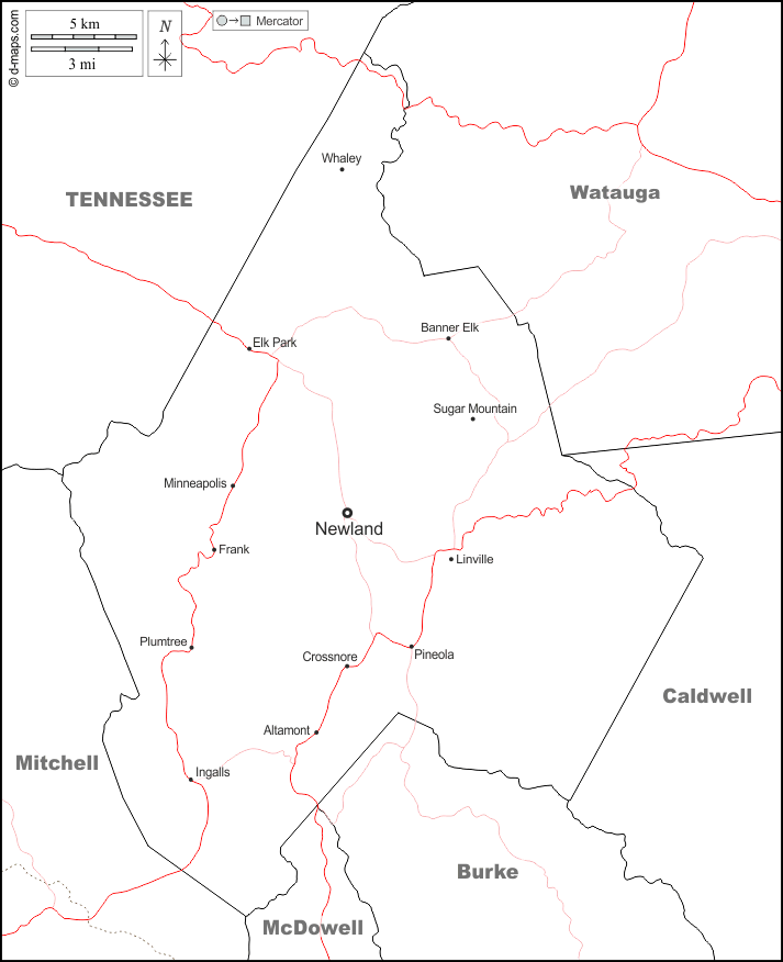 d-maps > संयुक्त राज्य > नॉर्थ कैरोलिना > एवरी > सीमाओं, मुख्य शहरों, सड़कों, नाम, सफेद