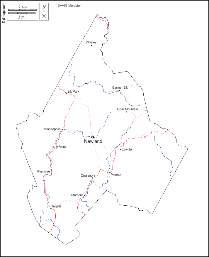 d-maps > संयुक्त राज्य > नॉर्थ कैरोलिना > एवरी > बाह्यरेखा, जल-सर्वेक्षण, मुख्य शहरों, सड़कों, नाम, सफेद