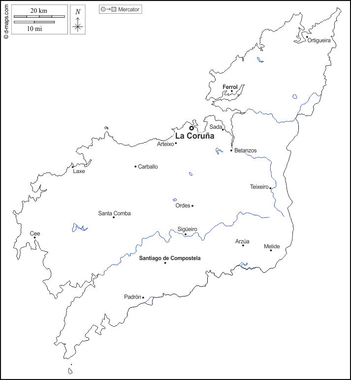 d-maps > यूरोप > स्पेन > कोरुना > बाह्यरेखा, जल-सर्वेक्षण, मुख्य शहरों, नाम, सफेद