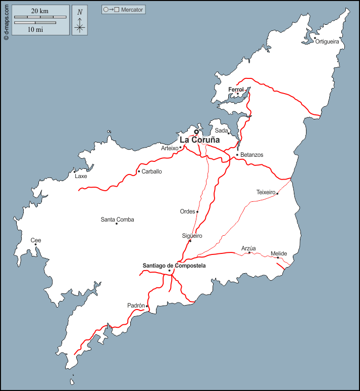 d-maps > यूरोप > स्पेन > कोरुना > बाह्यरेखा, मुख्य शहरों, सड़कों, नाम