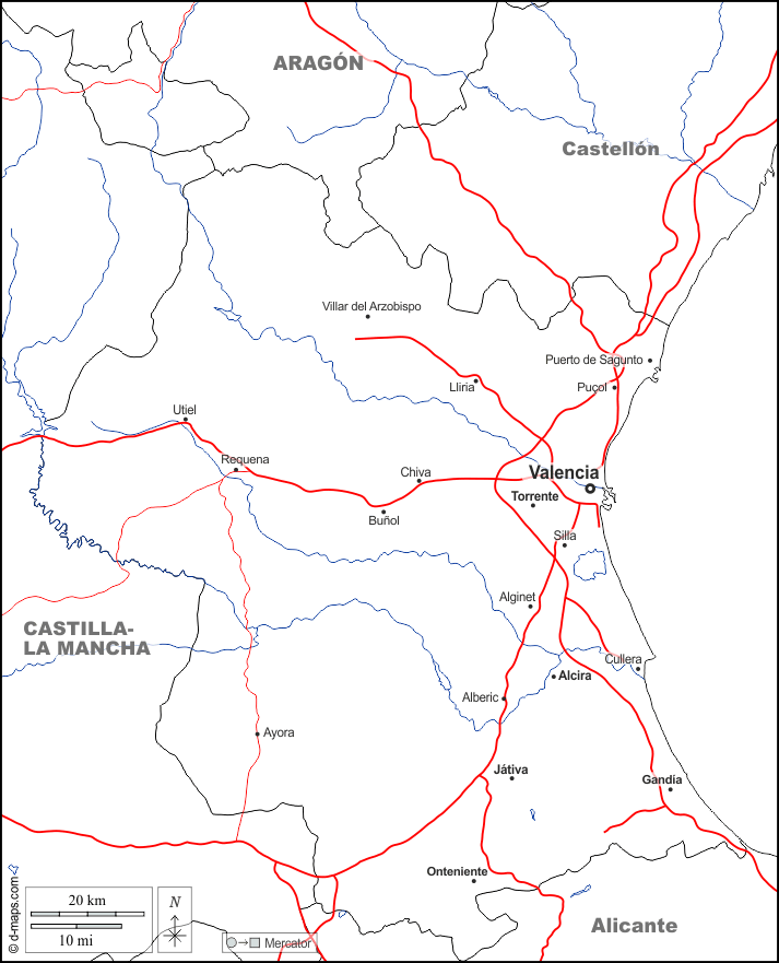 d-maps > यूरोप > स्पेन > वालेंसिया > सीमाओं, जल-सर्वेक्षण, मुख्य शहरों, सड़कों, नाम, सफेद