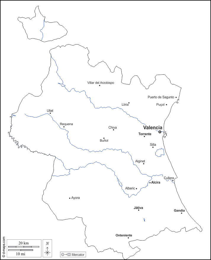 d-maps > यूरोप > स्पेन > वालेंसिया > बाह्यरेखा, जल-सर्वेक्षण, मुख्य शहरों, नाम, सफेद