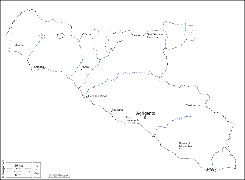 d-maps > यूरोप > इटली > एग्रीजेंटो > बाह्यरेखा, जल-सर्वेक्षण, मुख्य शहरों, नाम, सफेद