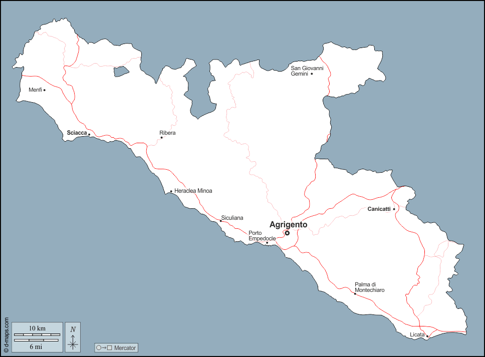d-maps > यूरोप > इटली > एग्रीजेंटो > बाह्यरेखा, मुख्य शहरों, सड़कों, नाम