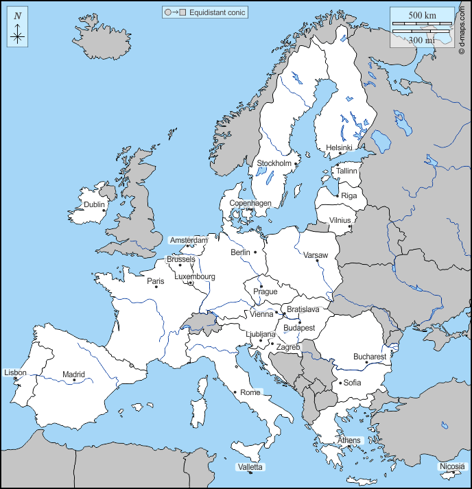d-maps > यूरोप > यूरोपीय संघ > तटों, सीमाओं, जल-सर्वेक्षण, राज्यों, राजधानियों, नाम
