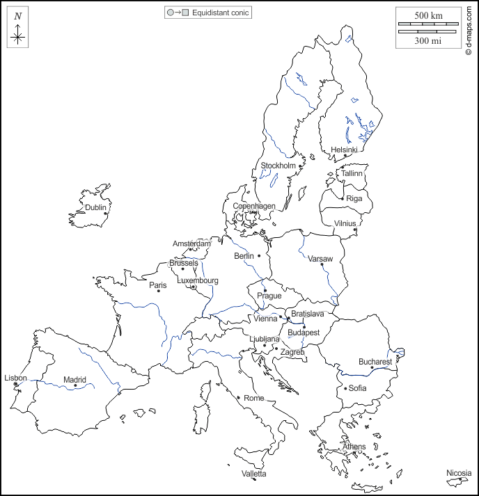 d-maps > यूरोप > यूरोपीय संघ > बाह्यरेखा, जल-सर्वेक्षण, राज्यों, राजधानियों, नाम, सफेद