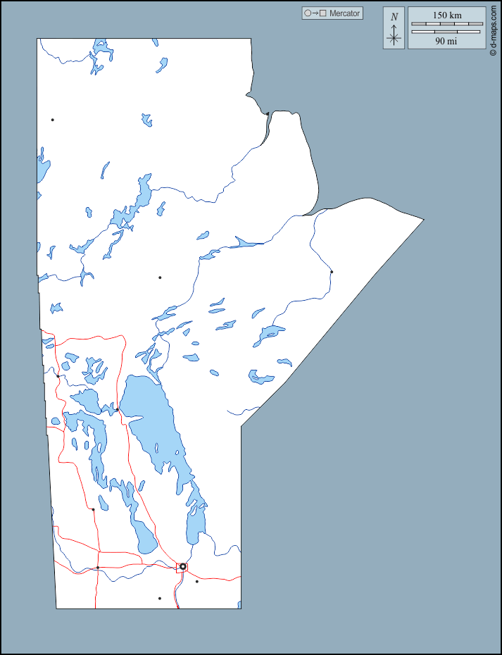 d-maps > महाअमेरिका > कनाडा > मैनिटोबा > बाह्यरेखा, जल-सर्वेक्षण, मुख्य शहरों, सड़कों
