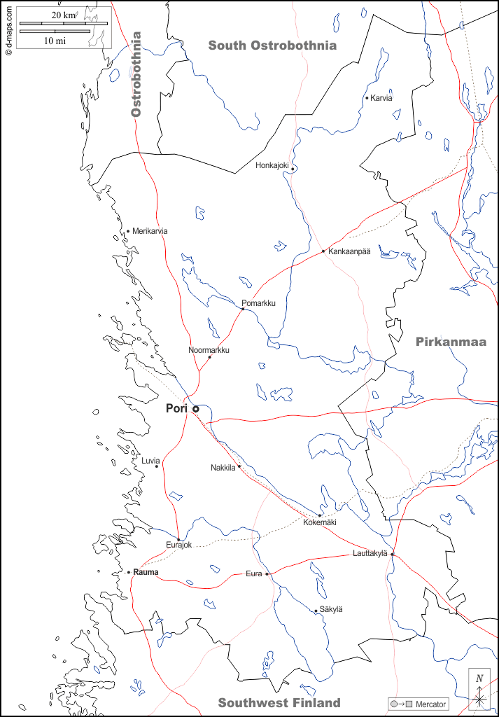 d-maps > यूरोप > फ़िनलैंड > सतकुंता > सीमाओं, जल-सर्वेक्षण, मुख्य शहरों, सड़कों, नाम, सफेद