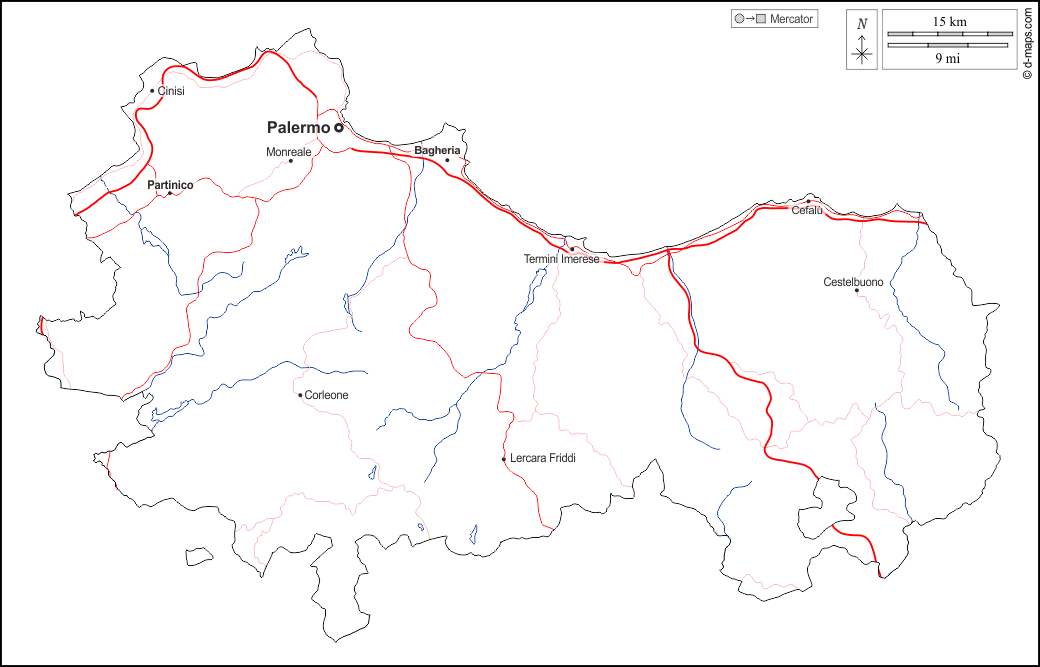 d-maps > यूरोप > इटली > पलेर्मो > बाह्यरेखा, जल-सर्वेक्षण, मुख्य शहरों, सड़कों, नाम, सफेद