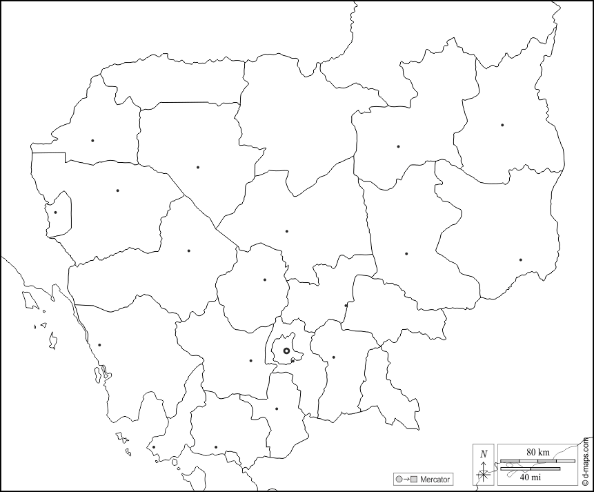 d-maps > एशिया > कंबोडिया > कंबोडिया > सीमाओं, प्रांतों, मुख्य शहरों, सफेद
