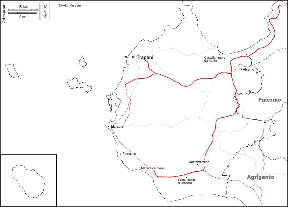 d-maps > यूरोप > इटली > सिसिली पश्चिम > सीमाओं, मुख्य शहरों, सड़कों, नाम, सफेद