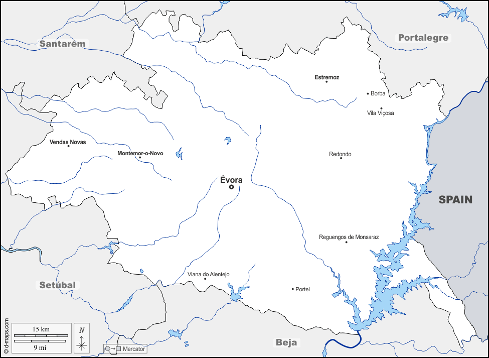 d-maps > यूरोप > पुर्तगाल > एवोरा > सीमाओं, जल-सर्वेक्षण, मुख्य शहरों, नाम