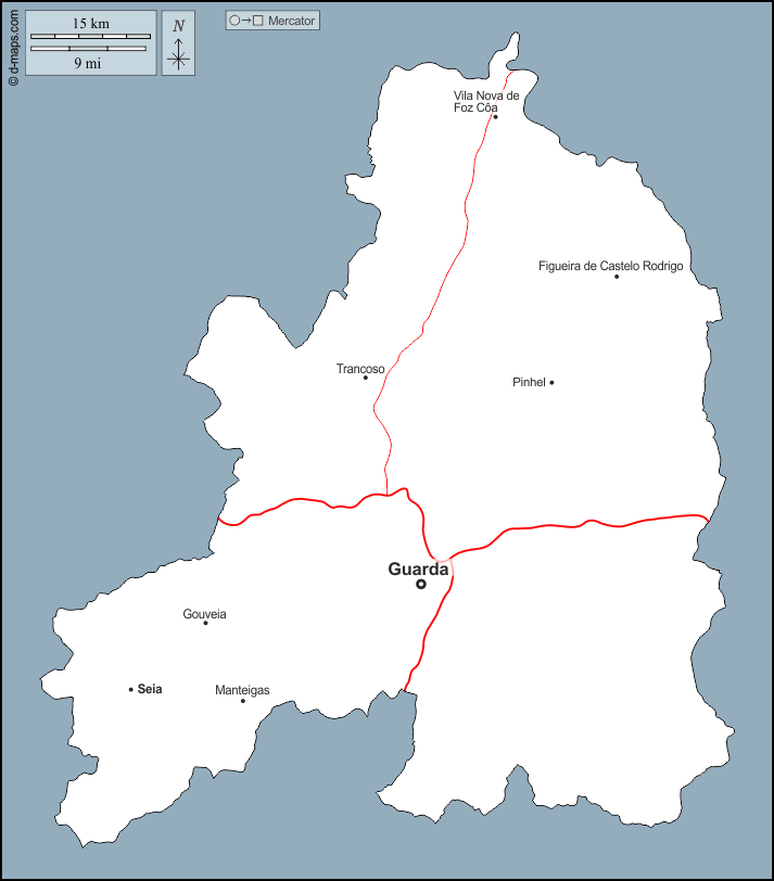 d-maps > यूरोप > पुर्तगाल > चौकीदार > बाह्यरेखा, मुख्य शहरों, सड़कों, नाम